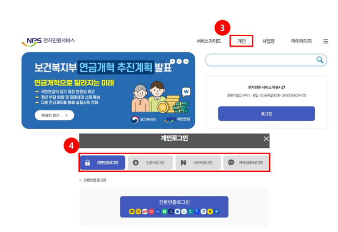 → 다음 상단의 ‘개인’을 선택하고 간편인증/인증서/네이버/카카오페이 등 본인이 편한 방법으로 로그인을 진행합니다. 본인의 국민연금 가입내역, 예상수령액 등 정보를 보기 위해서는 개인 본인인증 로그인은 필수 단계입니다.