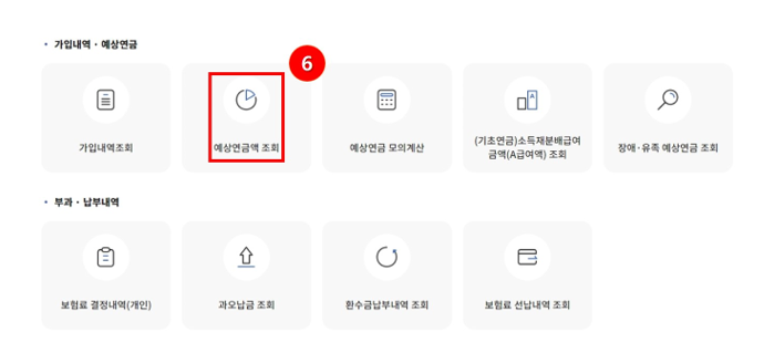 → 로그인을 완료하면 가입내역〮예상연금 항목에서 ‘내 국민연금 가입내역 및 예상연금액 조회’를 쉽게 확인할 수 있는데 먼저 가입내역 조회를 눌러서 내 국민연금 가입이 잘 되어 있는지 확인합니다.